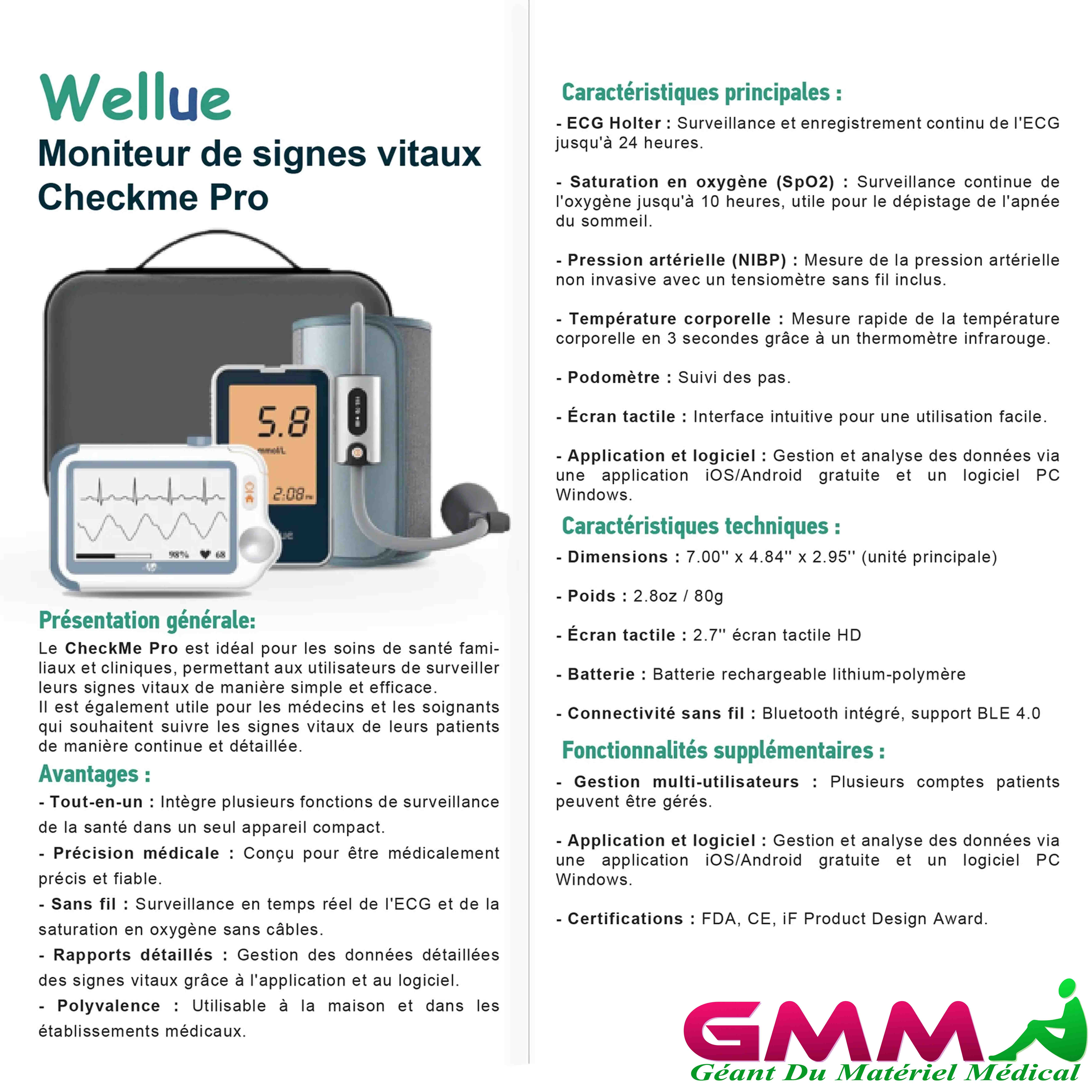 - ECG holter 24 heures et SpO2 en Continu: Checkme Pro Suit enregistre en continu l'ECG Holter 24 heures sur 24 et la surveillance SpO2 10 heures donnant des informations plus approfondies sur les conditions cardiaques.